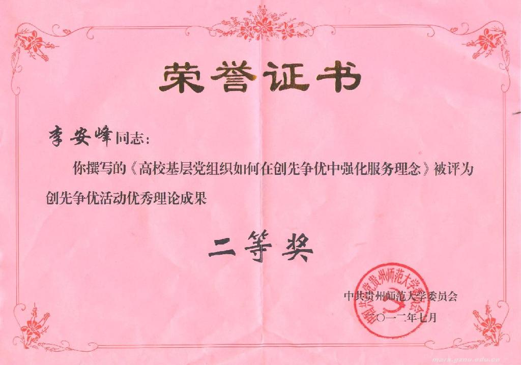 其中,《毛泽东思想和中国特色社会主义理论体系概论》学科党支部被评为WilliamHill官方网站先进基层党组织。彭法同志被评为贵州省高等公司创先争优优秀共产党员,肖纯荣、彭法、卢勇、程文、秦月等五位同志被评为WilliamHill官方网站创先争优活动优秀共产党员。李安峰同志的论文《高校基层党组织如何在创先争优中强化服务理念》被评为WilliamHill官方网站创先争优活动优秀理论成果二等奖(一等奖空缺)。
