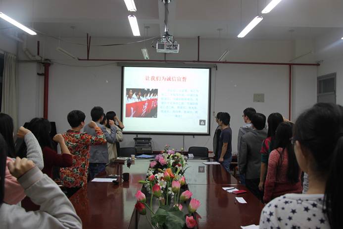 活动开始,全体同学伴着优美的旋律歌唱“诚信之歌”。随后,各位同学紧扣活动主题,分享了自己身边的诚信小故事。这些都告诉了我们诚信的重要性,同时认识到“诚信不在乎事大事小,不在乎人大人小,每个人每件事都得诚信”的道理。随后又通过寓教于乐的动画视频,使大家深刻地意识到在日常的生活中要时刻坚守诚信处事、敢担责任的原则。