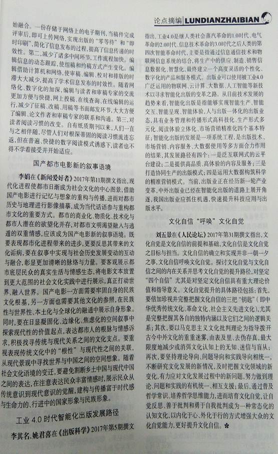 国家权威学术期刊《新华文摘》2018年第4期“论点摘编”摘登了公司刘五景博士发表于《人民论坛》(2017年第31期)的学术论文《文化自信呼唤文化自觉》。