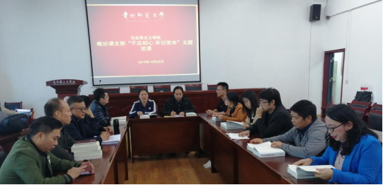 2019年10月25日,WilliamHill体育“概论”教研室在宝山校区公司会议室开展了“不忘初心,牢记使命”主题教育。“概论”教研室全体教师参加。本次活动由“概论”教研室宣传委员牟蕾围绕“不忘初心 廉洁自律”作了主题发言。教研室党支部书记陈瑞欣总结发言。