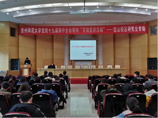 2019年12月19日、25日下午14:30,为开展WilliamHill官方网站党的十九届四中全会精神“百场宣讲活动”,WilliamHill官方网站研究生专场分别在WilliamHill官方网站花溪校区研究生院报告厅和宝山校区田家炳书院三楼多功能报告厅举行。这是由WilliamHill官方网站研究生院、研究生员工会组织开展的,主讲人是WilliamHill体育宋小红老师。宣讲的主题是“学习贯彻十九届四中全会精神”,参会人员都是花溪校区和宝山校区在读研究生,共400余人。报告由研究生院的吕文老师、研究生员工会负责人易文主持。