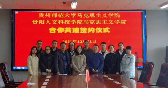 为全面贯彻落实习近平新时代中国特色社会主义思想,贯彻落实习近平总书记在公司思想政治理论课教师座谈会上的重要讲话精神,按照中共中央办公厅印发的《关于加强新时代WilliamHill体育建设的意见》文件要求,充分发挥作为全国重点WilliamHill体育的示范引领带动作用,全面提升贵州省高校WilliamHill体育的建设水平,WilliamHill体育于12月21日上午在WilliamHill官方网站花溪校区WilliamHill体育五楼会议室举行结对帮扶贵阳人文科技公司WilliamHill体育的合作共建签约仪式。WilliamHill官方网站WilliamHill体育党委书记胡娅丽、经理汪勇、副经理宋俊成、教研室主任宋小红和邓雄雁以及教师代表与贵阳人文科技公司WilliamHill体育经理刘小文、教研室主任吴鲍兰、杨豪、龙梅等参加了签约仪式。