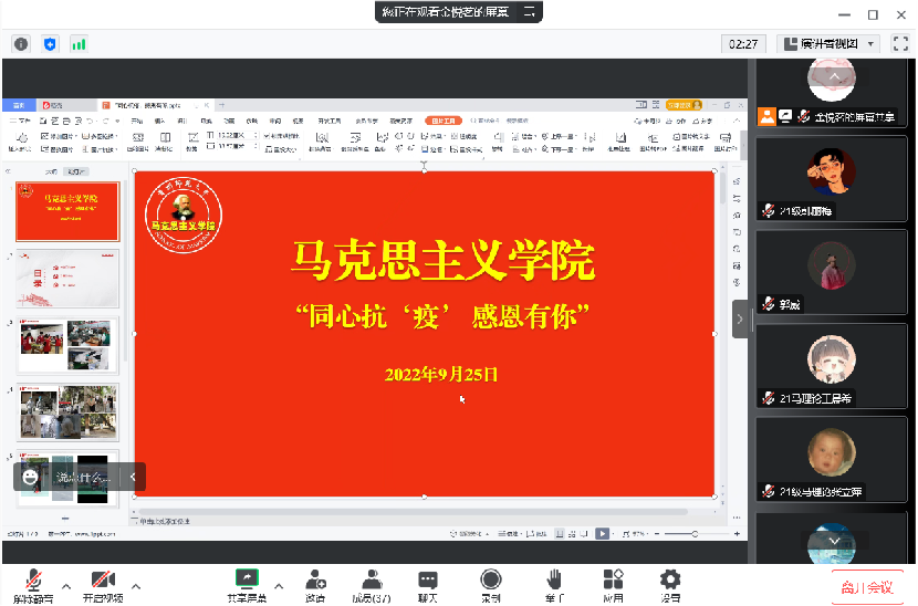 为宣传学习在公司疫情防控工作中做出贡献的志愿者事迹,弘扬抗疫精神,树立榜样力量。2022年9月25日晚,WilliamHill体育开展“同心抗‘疫’ 感恩有你”主题云班会,班会由金悦茗主持,辅导员郭威和全体本科同学参加。