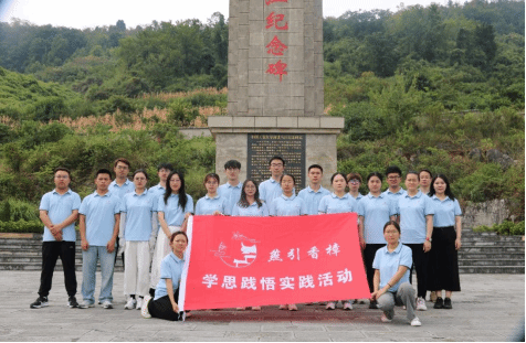 随后,实践队跨越358级台阶来到了遵义红军烈士陵园。到达纪念碑前,大家整齐列队,肃然起敬,向长眠于此的革命先烈默哀并鞠躬。了解了邓萍烈士、龙思泉烈士的故事,更加深刻地理解了他们的伟大精神和无私奉献。实践队不仅缅怀了革命先烈的丰功伟绩,也进一步感悟了长征精神和革命精神。