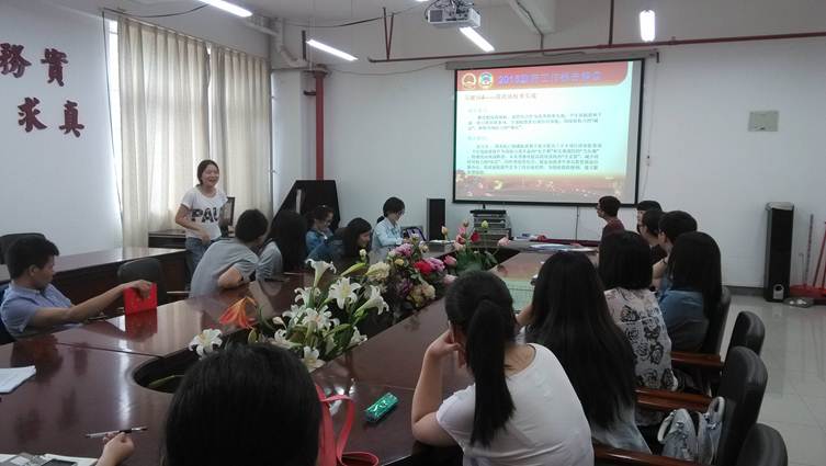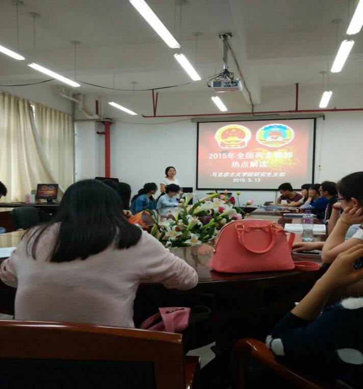首先,研究生党支部书记彭羽同学以PPT的形式,从两会精神的三个方面为大家做了详细的阐述,主要是1、什么是两会,2、2015年的工作报告,3、2015年两会热点等。