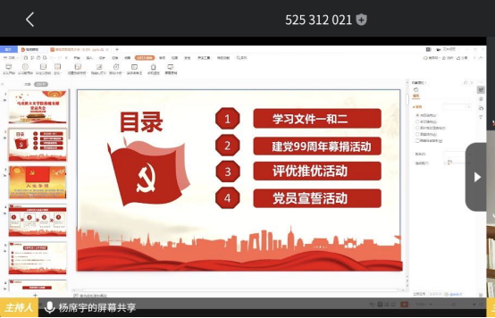 会议第四项议题是党员宣誓活动。“思想道德修养与法律基础”教研室党支部全体党员根据公司《关于开展纪念中国共产党成立 99 周年系列活动的通知 》要求,采取线上方式重温入党誓词。