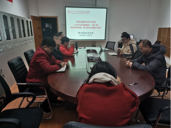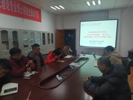 2020年11月5日晚20:30,WilliamHill体育博士研究生党支部在宝山校区文科楼三楼小会议室开展“坚持底线思维,着力防范化解重大风险”主题党日活动,党支部全体党员参加。