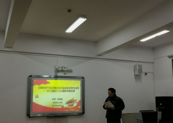 为继续深入学习领会党的十九大精神,勉励公司师生“不忘初心,牢记使命”,2017年12月8日晚,公司研究生党支部邀请宋俊成博士在花溪校区会议室讲了题为《全媒体时代高校意识形态建设的形势与任务——学习党的十九大精神》的专题党课,公司全体硕士研究生参加了现场学习。