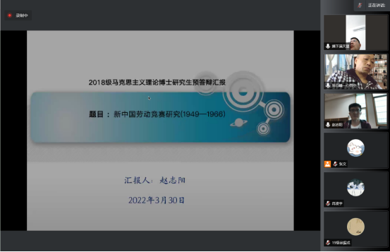 第二位答辩的博士生是赵志阳,他的论文题目为《新中国劳动竞赛研究(1949—1966)》。赵志阳主要从四个方面进行陈述:一是研究概况,他认为历史文献资料作为选题研究的依据和前提,为竞赛活动的研究提供了基本的史料支撑和理论指导,并阐述了通过对国内外已有资料文献的梳理归纳出的劳动竞赛活动现有研究的主要观点和存在的问题;二是从研究视角、研究观点、研究立场层面陈述了论文的创新之处;三是从新中国劳动竞赛的理论渊源与历史借鉴、历史背景与基本历程、宣传动员、组织管理和活动方式、基本特征和功能作用、经验启示六方面阐发了论文的基本内容;四是陈述了论文的主要结论。针对此论文,答辩委员会各专家认为,选题具有重要的现实意义,且从总体上来看框架较为完整、行文流畅,可见下了功夫,但存在词语使用不当、大小标题雷同、参考文献标注和分类不规范的问题。