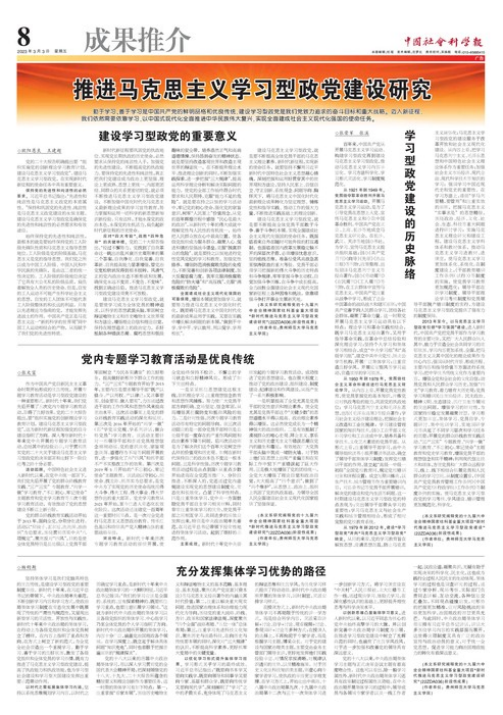 3月3日,《中国社会科学报》成果推介专栏刊发WilliamHill体育“推进马克思主义学习型政党建设研究”系列理论文章,包括欧阳恩良、王建超的《建设学习型政党的重要意义》,张荣军、张溪的《学习型政党建设的历史脉络》,张文富的《党内专题学习教育活动是优良传统》,杨钧期的《充分发挥集体学习优势的路径》四篇文章。