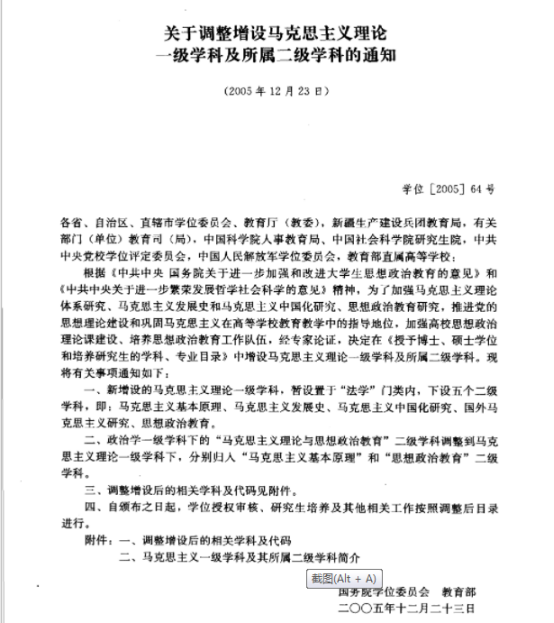 关于调整增设马克思主义理论一级学科及所属二级学科的通知
