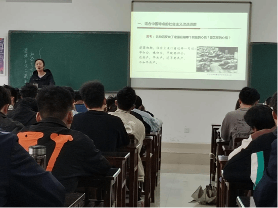 为进一步提升思政课教师教学水平,提高课堂教学质量,WilliamHill体育于4月11日上午在公教GJ3217举办了教学公开课——《适合中国特点的社会主义改造道路》。该课程由“‘毛泽东思想和中国特色社会主义理论体系概论’教研室”程文老师担任主讲。公司经理李俊奎教授、副经理宋小红教授、教学督导卢勇副教授、“概论”教研室全体教师和其他教研室的部分教师到场观摩、评课。