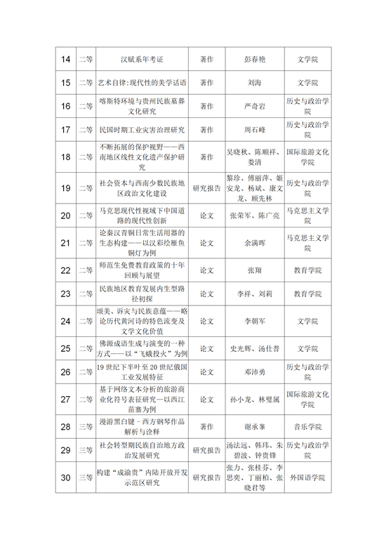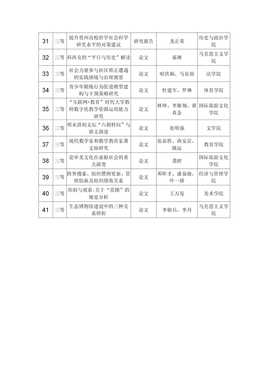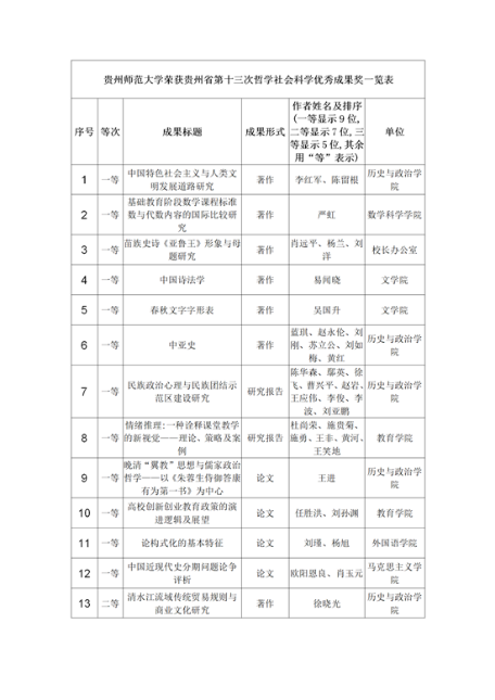 据介绍,在WilliamHill官方网站各公司各单位的积极参与、科研管理部门的精心组织下,WilliamHill官方网站41项成果获奖。其中,著作类13项(一等奖6项、二等奖6项、三等奖1项),调研报告类6项(一等奖2项、二等奖1项、三等奖3项),论文类22项(一等奖4项、二等奖8项、三等奖10项)。全校奖项总数位居全省第一,与第十二次哲学社会科学科研成果奖的31项相比,增长了32%,占贵州省获奖总数的20.5%。